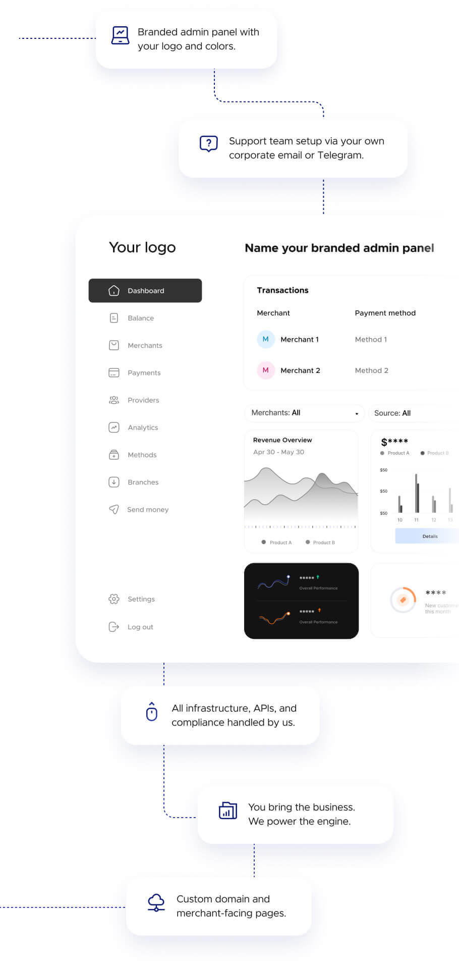 White-label ready from day one Unipesa empowers you to deploy a fully branded, enterprise-level payment infrastructure under your own name. Ideal for banks, fintechs, payment companies and aggregators. What’s included: